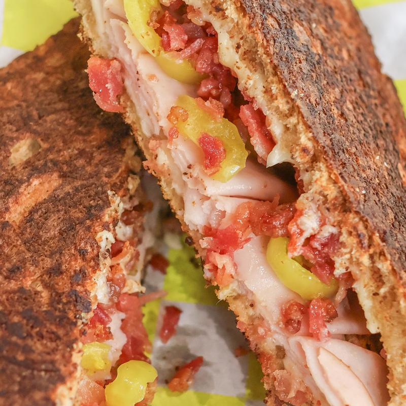 Delicious oven roasted turkey, chopped bacon, pepperjack cheese and a drizzle of chili infused honey grilled to perfection on wheatberry bread…boom!